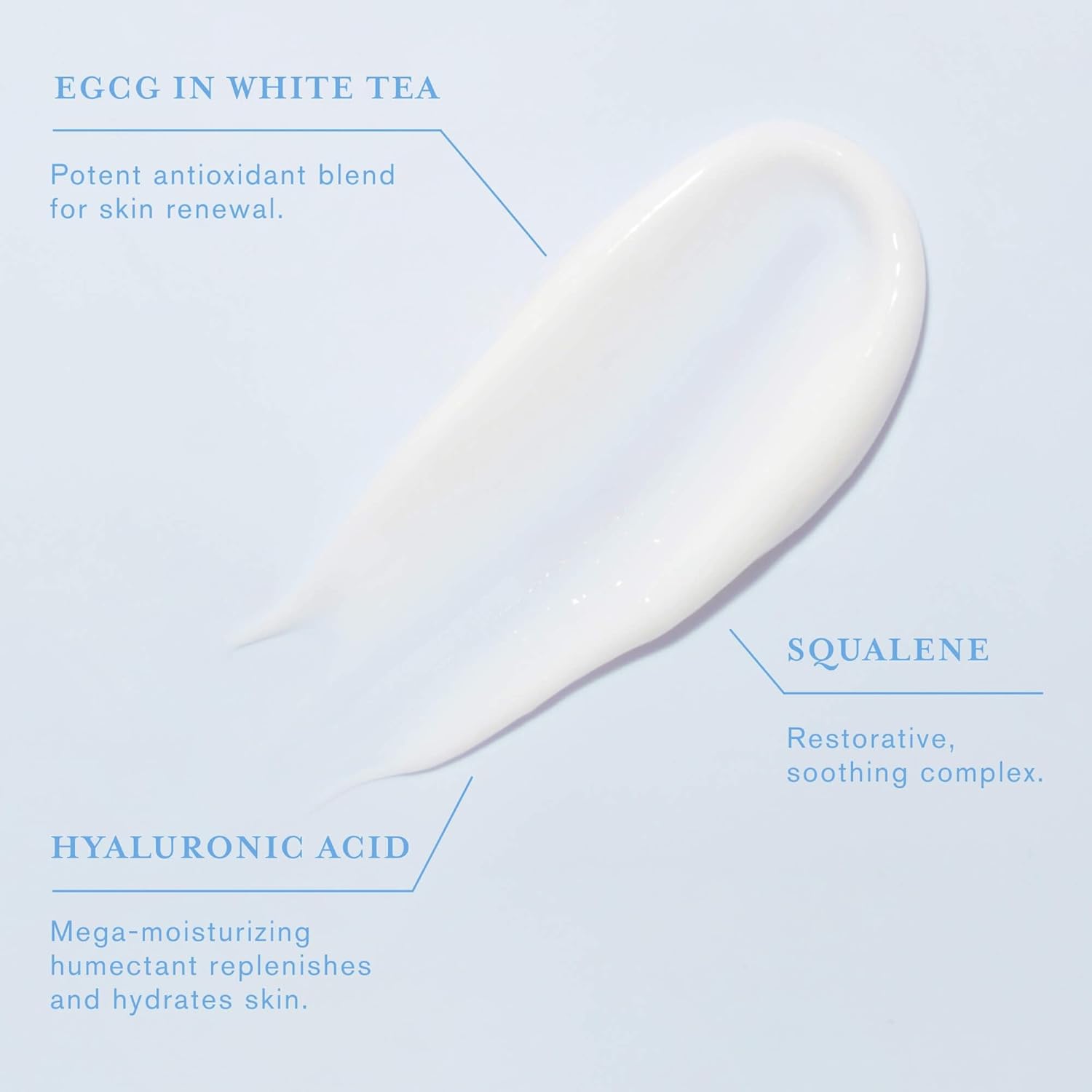 - FEATURED INGREDIENTS: EGCG in White Tea – A potent antioxidant that supports skin renewal. Hyaluronic Acid – A powerful humectant that attracts moisture from the air to keep the skin plump and dewy. Oleanolic Acid – A calming and soothing botanical blend. Squalane – A restorative and hydrating complex that heals and revitalizes the skin.