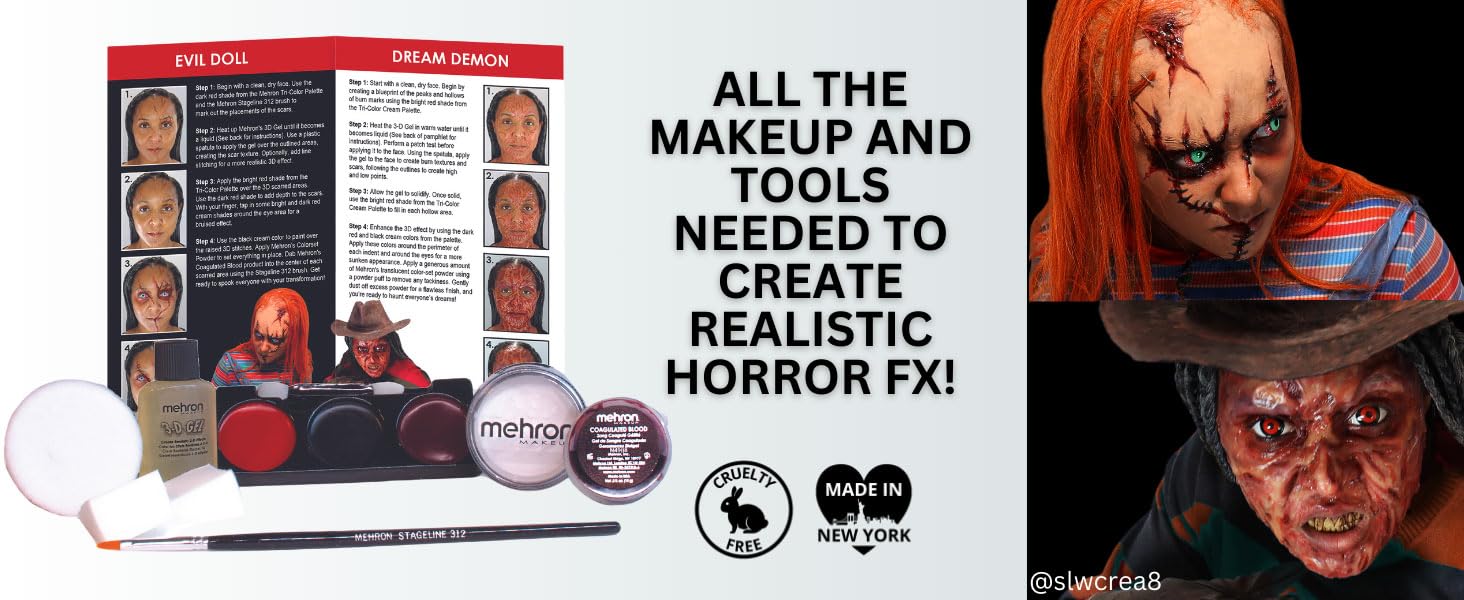 - PROFESSIONAL: The Mehron Premium Horror FX Character Kit is the ultimate mini Special FX kit. Filled with high quality SFX products and 2 easy to follow tutorials, you'll have everything you need to recreate either the Dream Demon, the Evil Doll, or other iconic Horror legends with this all-inclusive makeup kit!