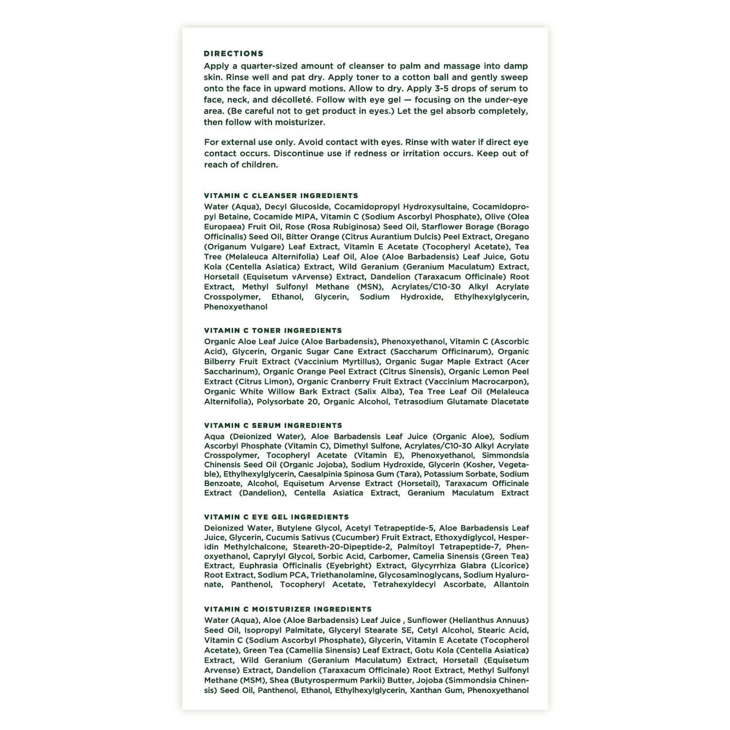 - Our full Vitamin C collection for your brightest, smoothest skin yet. The Vitamin C Cleanser gently removes impurities, brightens, and moisturizes; while Vitamin C Toner lifts away excess oil, makeup, and residue.The Vitamin C Serum brightens, reduces the look of dark spots, and evens the skin tone. Vitamin C Eye Gel minimizes the appearance of dark circles, puffiness, and fine lines. Vitamin C Moisturizer visibly brightens as it hydrates and softens.