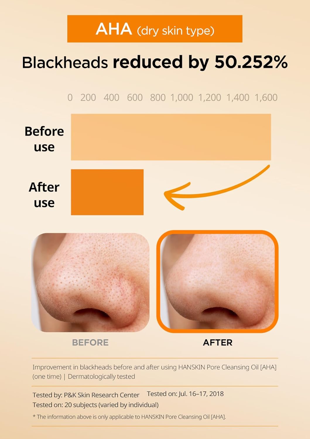 - Waterproof Makeup Remover & Non- eye irritation: Effortlessly dissolve even the most stubborn waterproof makeup without causing eye irritation. Hanskin’s gentle AHA Pore Cleansing Oil purifies pores while being kind to your eyes, leaving your skin clean, refreshed, and balanced.