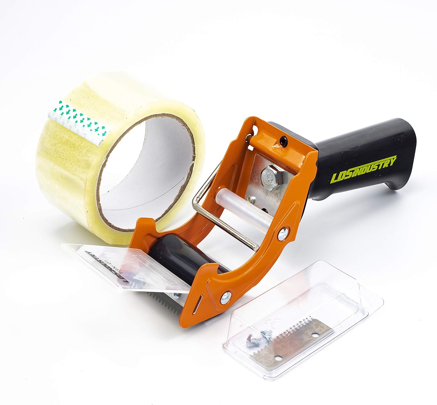 Rapid-Replace Packing Tape Dispenser Gun with Tape and Extra Blade, 2IN(50mm) Lightweight Ergonomic Industrial Handheld Tape Cutter for Carton, Packaging and Box Sealing (Orange)