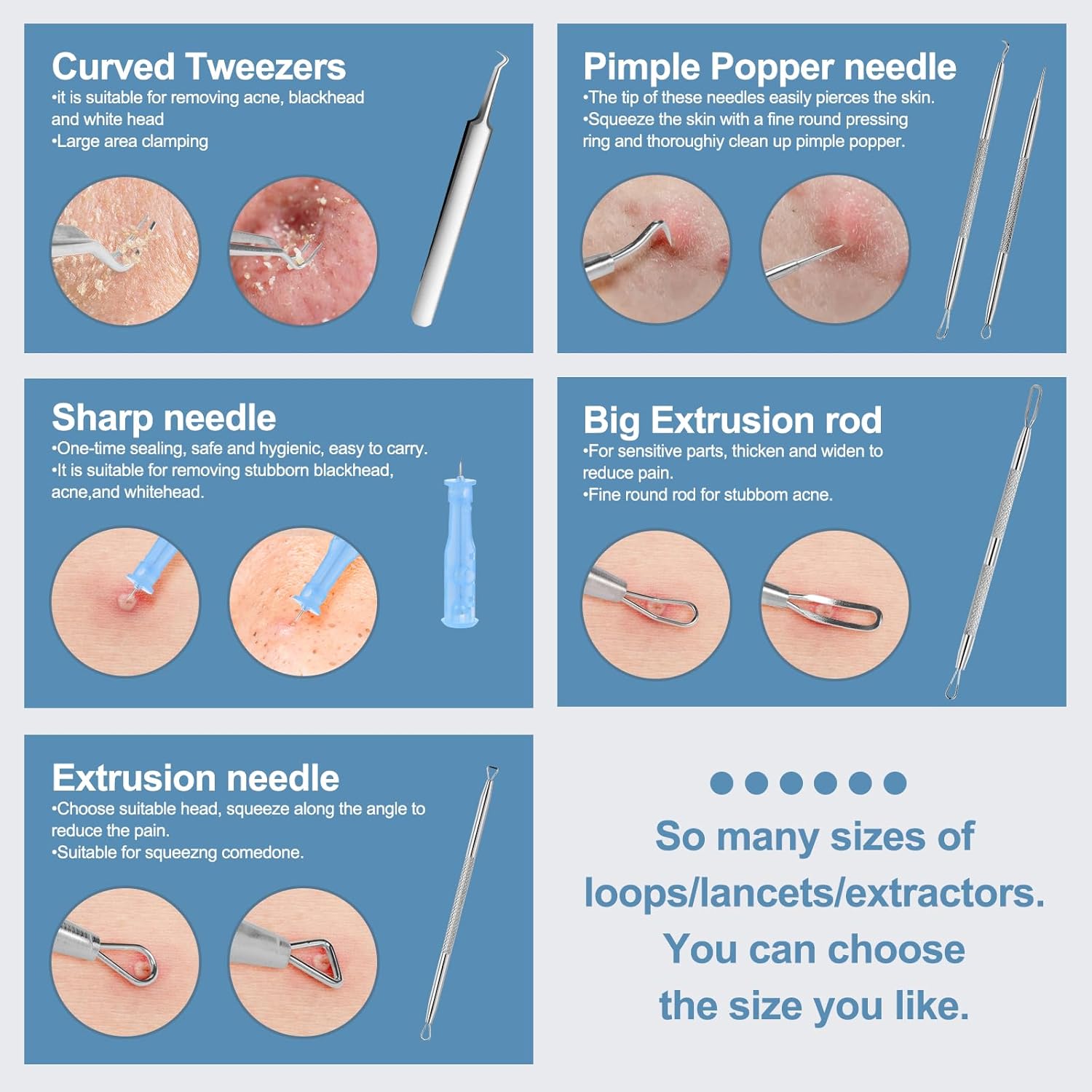 - ♥ 【Extraction Tools】: 60 pieces extraction tools for estheticians can help to remove blackheads, whiteheads, Pimples, acne, various, blemishes and zit popping on your face, chin, cheek, body, forehead and nose easily. Instead of spending thousands of dollars on a professional, you can get the same results with our pimple popping kit.