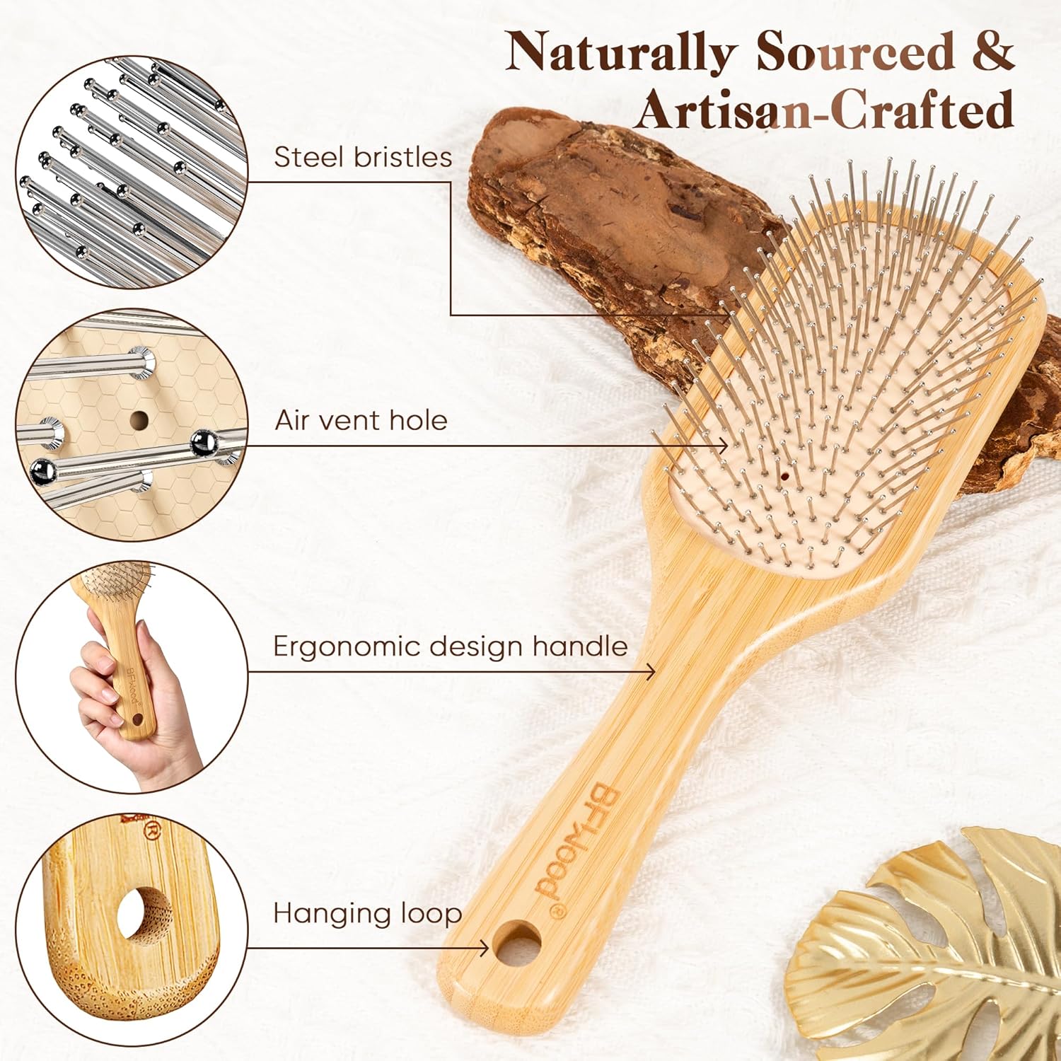 BFWood Bamboo Hair Brush with Steel Bristles, Help Hair Growth and Massaging Scalp
