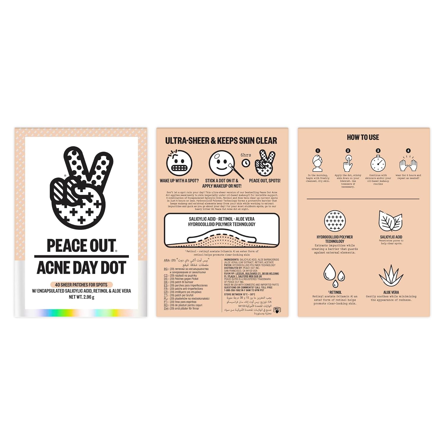 PEACE OUT Acne Day Dot, Sheer Acne Healing Dots, Virtually Invisible Wear, Hydrocolloid Pimple Patches Helps Clear Blemishes Quickly with Encapsulated Salicylic Acid, Retinol & Aloe Vera, 40 dots