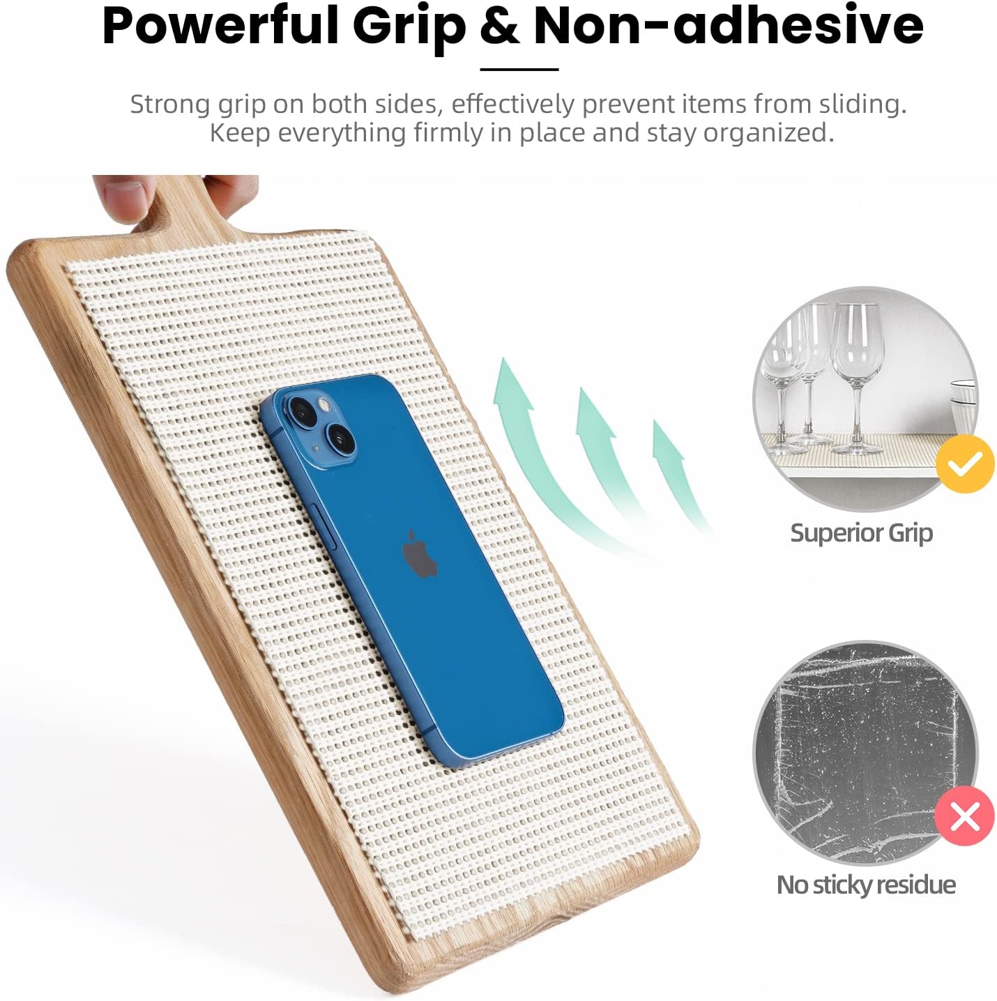 - POWERFUL GRIP & NON-ADHESIVE- BAGAIL shelf and drawer liners have strong grip on both sides, made of advanced high-durability material, effectively prevent items from sliding or bunching in your drawers or cabinet shelves. Keep everything firmly in place and stay organized. The non-adhesive design leaves no glue or sticky residue for easy cleaning and installation.
