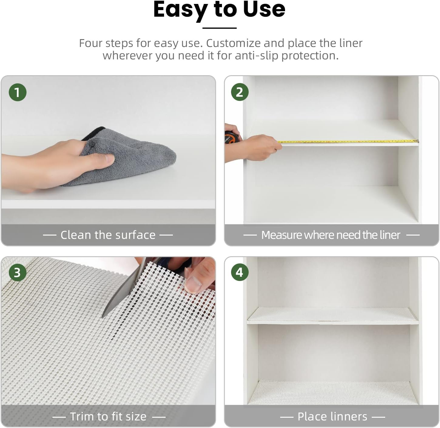 - EASY TO TRIM & CLEAN - Unique grid design makes it easy to cut and shape to the exact size with household scissors, easily install the liner where you want it, such as a drawer or kitchen cabinet. Truly carefree to clean, you can just wipe with a damp cloth to clean it.