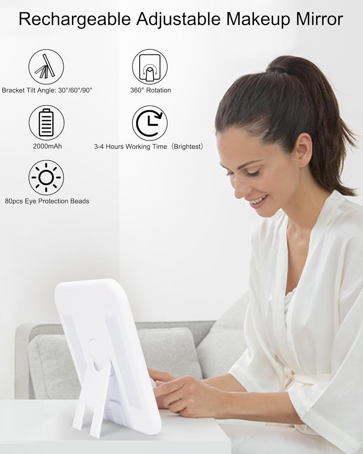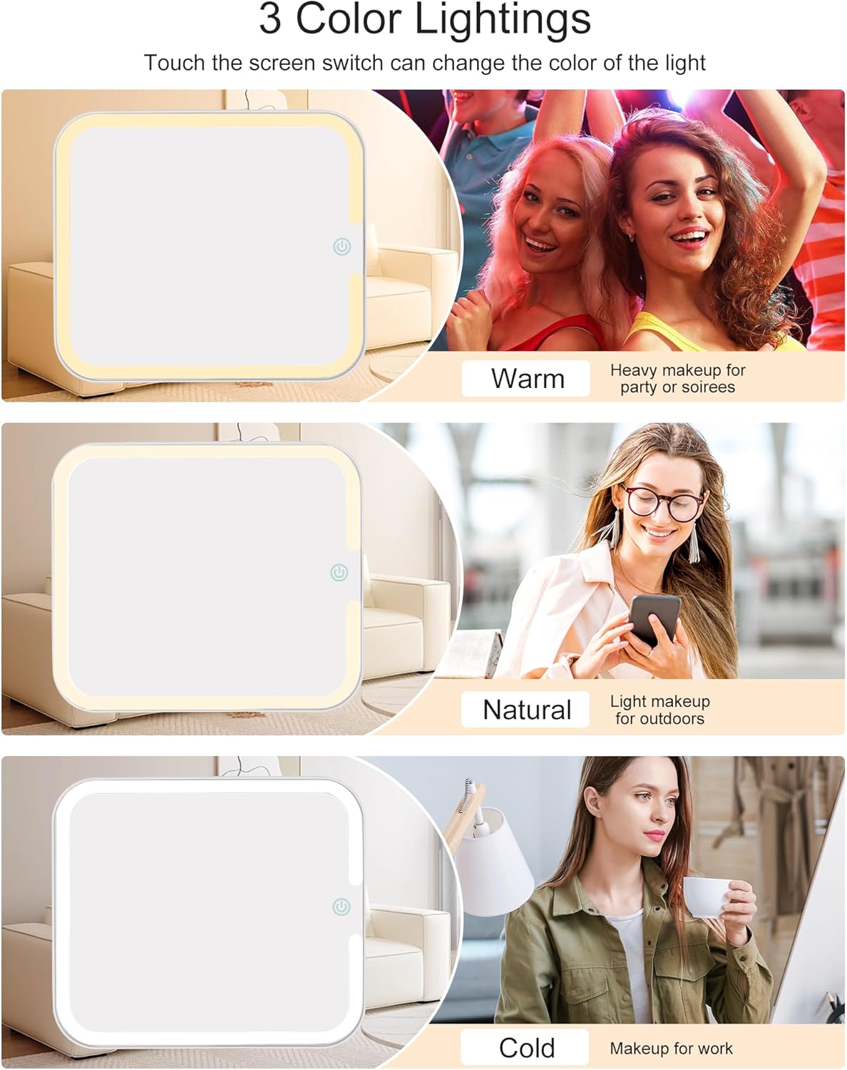 - Makeup Mirror with 3 Color Lights: The makeup bag with a rechargeable lighted makeup mirror, 3 Color Lights, and Brightness adjustment. providing white light, warm light, and cold light. Short press the sensor switch to change the color of the light, and long press to adjust the brightness of the light. Size 10.3'' x 9''x 4.7'' ((L x W x H).