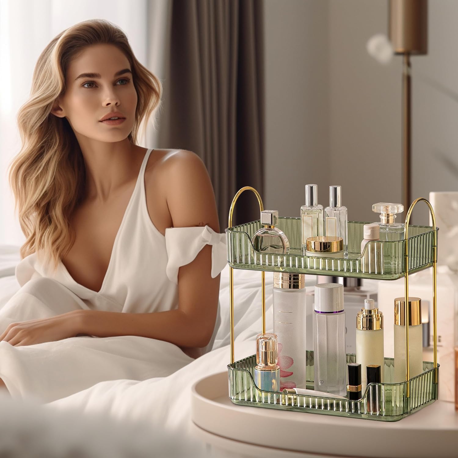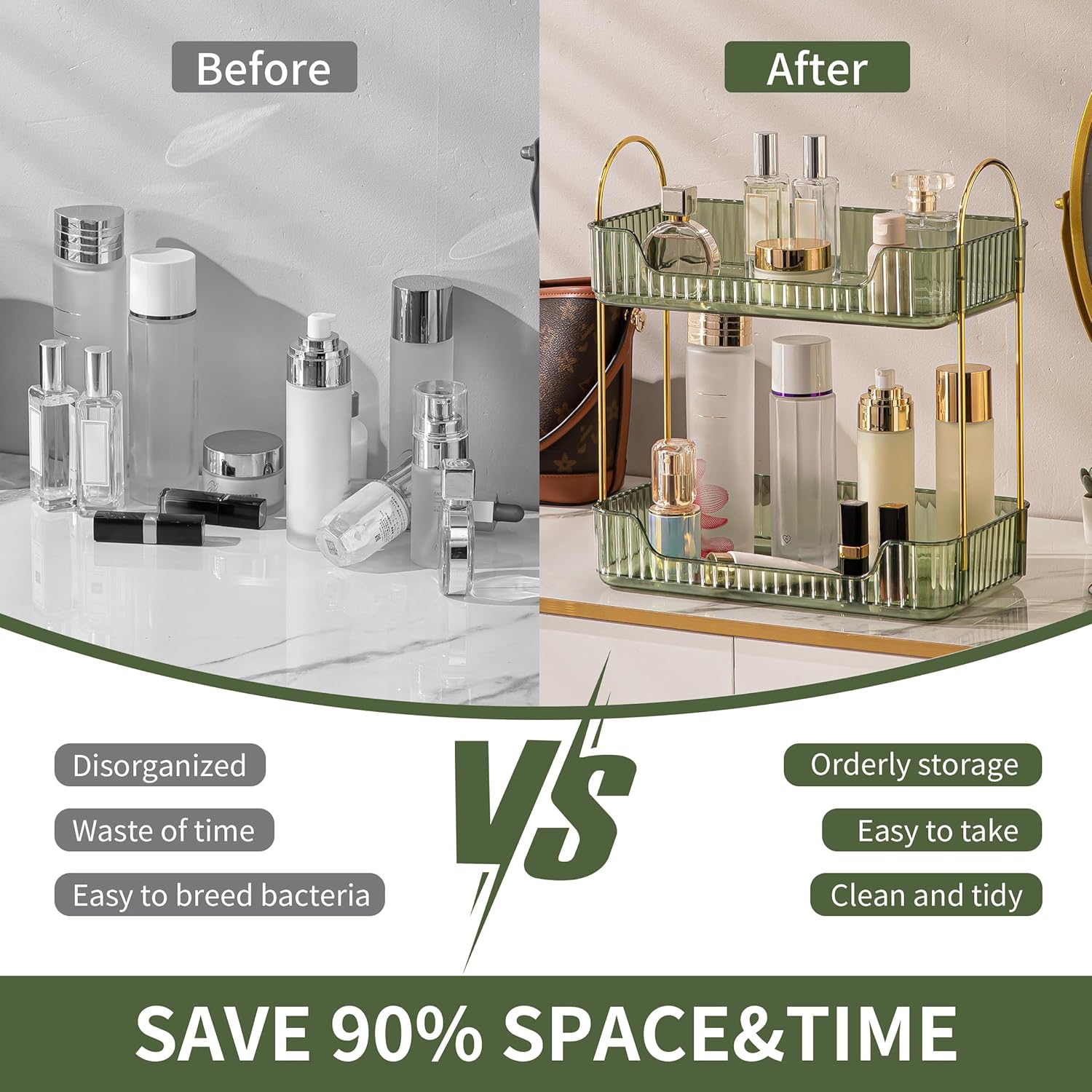 YCIA&DONE Bathroom Organizer Countertop, Makeup Storage, Skincare Cosmetic Tray Shelf, Perfume Holder Rack for Vanity Counter, Large Capacity, Easy to Install, Clean, 2 Tiers, Vintage Green