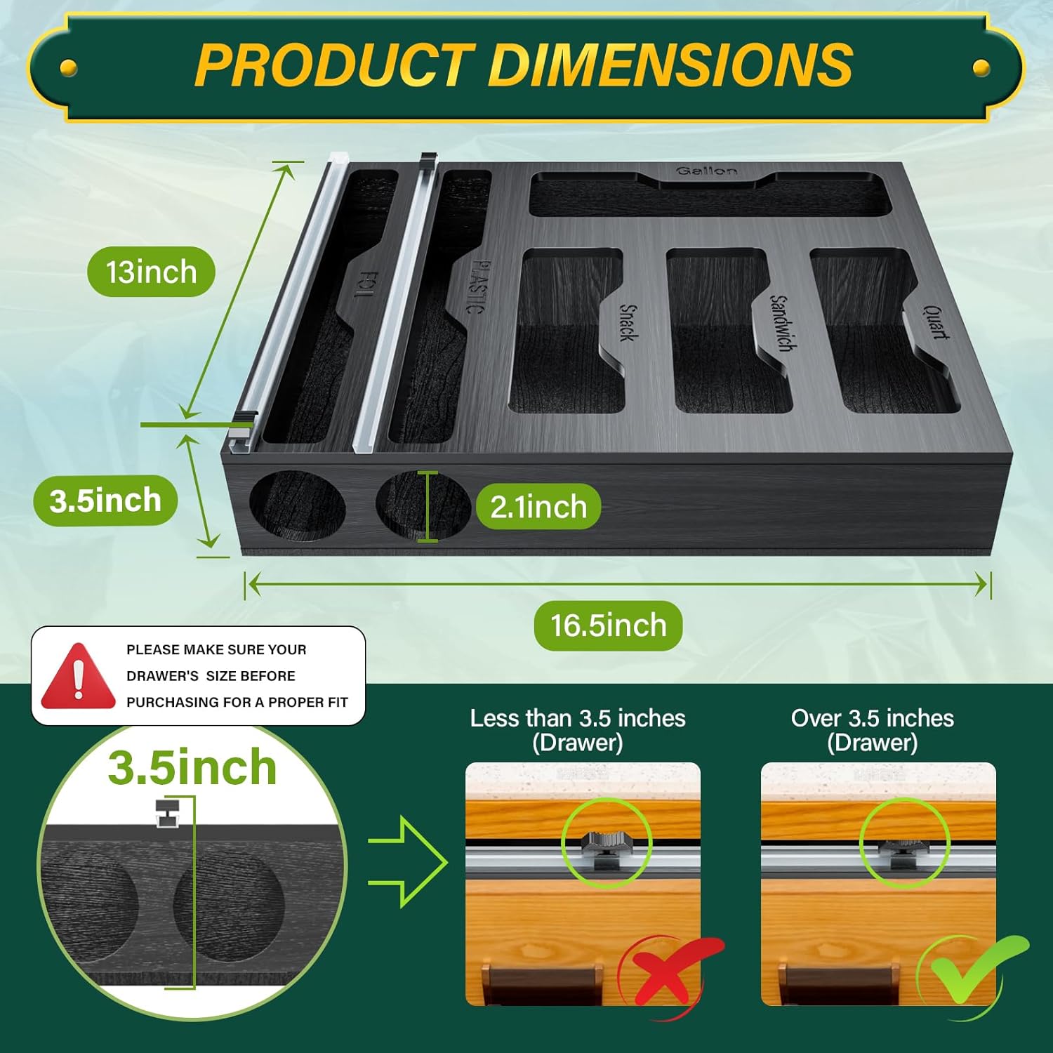 - 【6 IN 1 Baggie&Wrap Organizer 】The premium bamboo storage contains 4 bag organizers & 2 foil and plastic wrap dispenser with cutters. Keep your plastic wrap and food storage bags neat and organized with this bamboo box. A very beautiful and practical kitchen organizer and storage