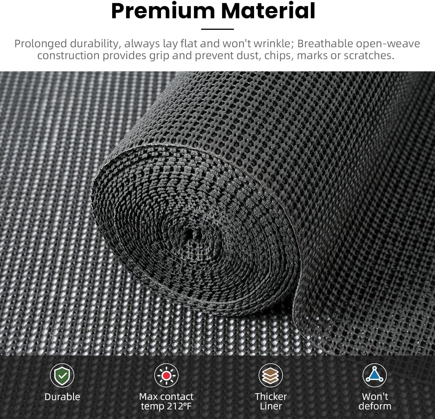 - PREMIUM MATERIAL - Made of high-quality PVC material, and won't deform, ensure long-term use without tearing; always lay flat and won't warp or wrinkle over time like other materials; open grid structure allows the surface to breathe while providing thick cushioning protection to prevent dust, chips, marks and scratches from damaging your cabinets, drawers and shelves.
