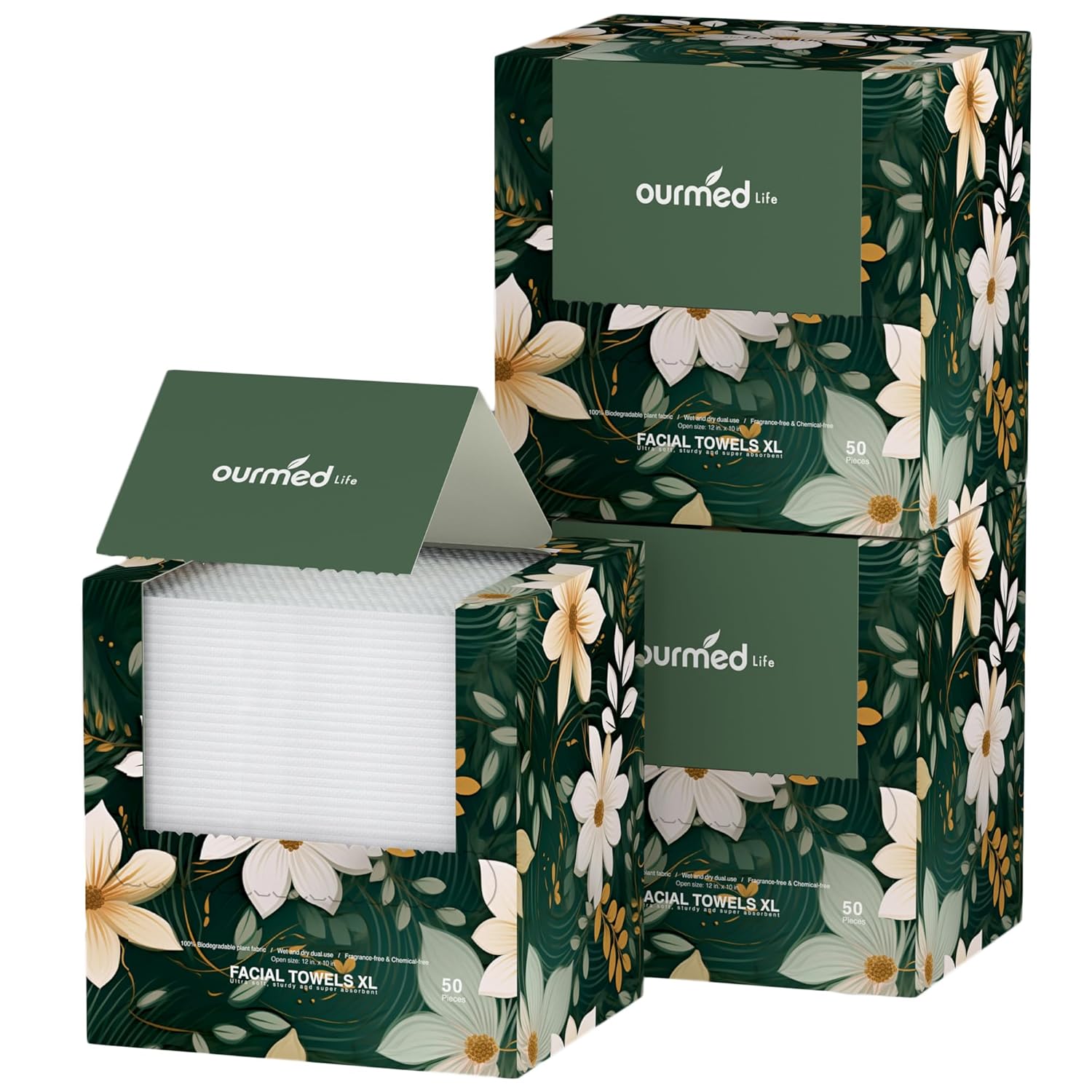 Ourmed Life Disposable Face Towels, Clean Facial Wash Cloth without Lint, Biodegradable Cleansing Dry Wipes, Skincare and Makeup Remover Towels for Sensitive Skin (Unscented, 150 Count, Pack of 1)