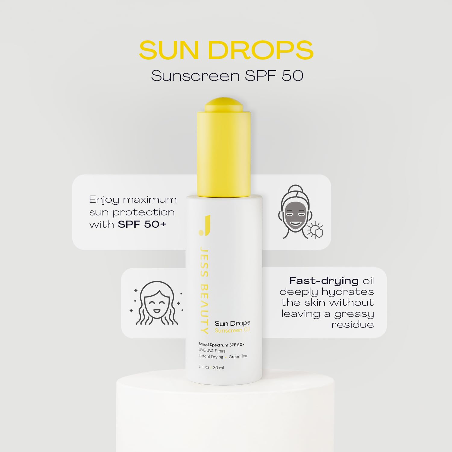 JESS BEAUTY | Face Sunscreen Sun Drops SPF 50 Skin Care Oil with Camellia Sinensis & Squalane | Skincare Fast Drying 1 fl. oz
