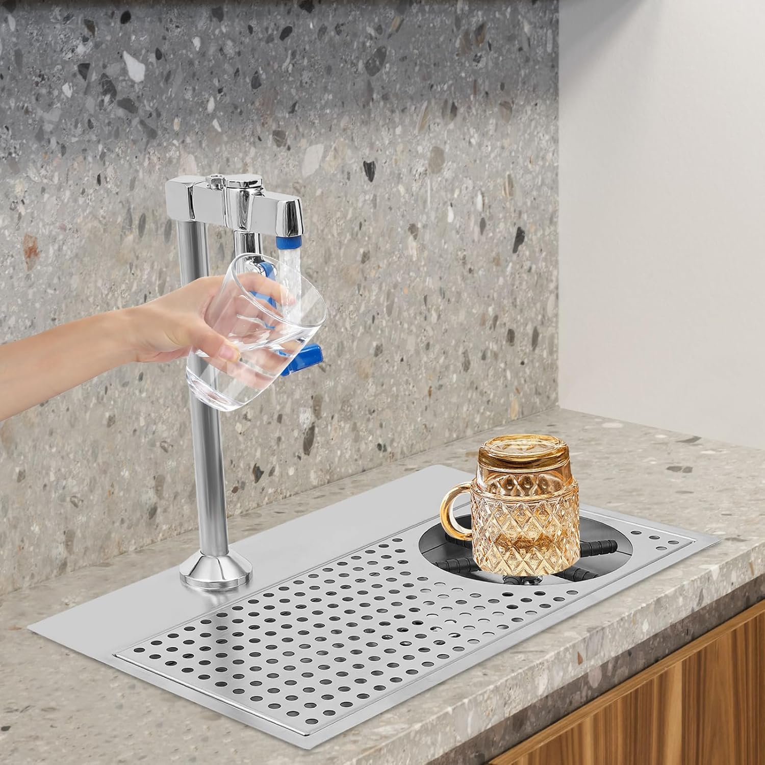 - ★【Design】The push-type faucet allows you to easily catch the water without controlling the faucet while holding cups. The perforated board provides temporary storage for your glasses.