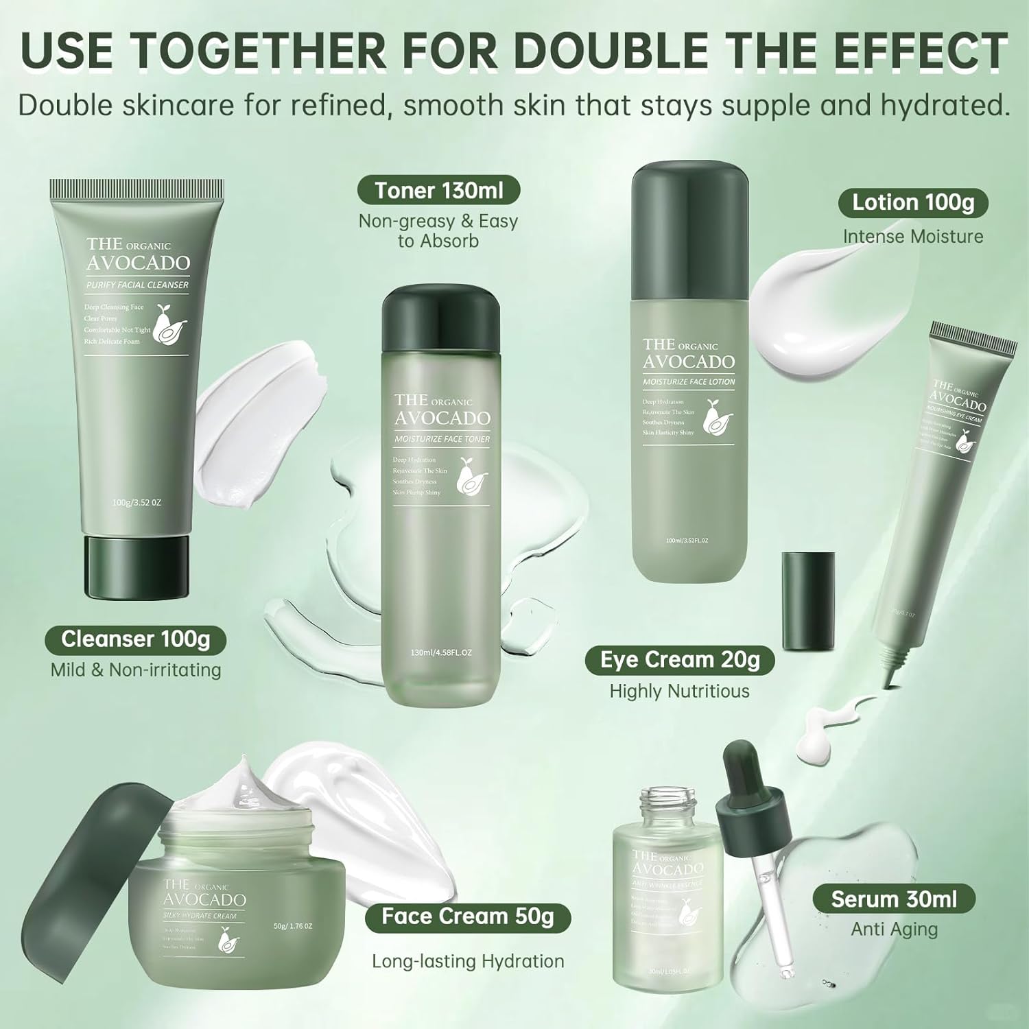Avocado Skin Care Set, Skincare Gifts Kits For Hydrating Skin, Anti Aging Facial Kit For Women With Facial Cleanser, Toner, Face Serum, Lotion, Face Cream, Eye Cream. (6 Pieces)