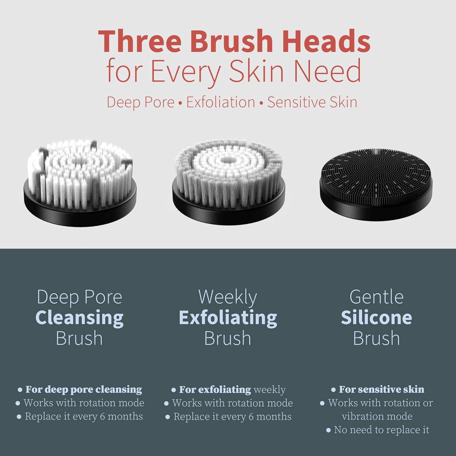 - Three Professional Brush Heads for Every Skin Need - Comes with three interchangeable heads: an uniquely designed tapered bristle brush for deep pore cleansing; a flat-ended exfoliating brush to buff away dead skin cells; and an ultra-soft silicone brush head designed for gentle daily cleansing on sensitive skin.