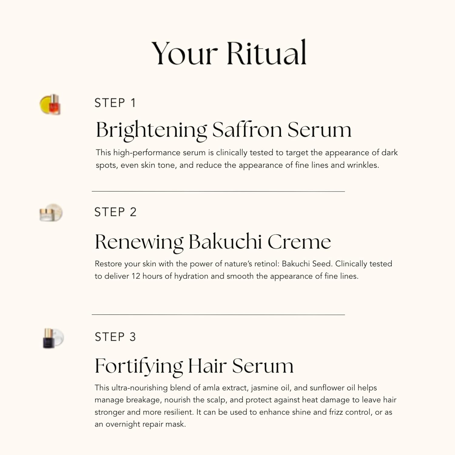 - Step Three, Fortifying Hair Serum - This pre-shampoo Ayurvedic hair serum works to nourish scalp health and improve hair shine. This powerful hair treatment that works to prevent hair damage while keeping existing strands lustrous and vibrant.