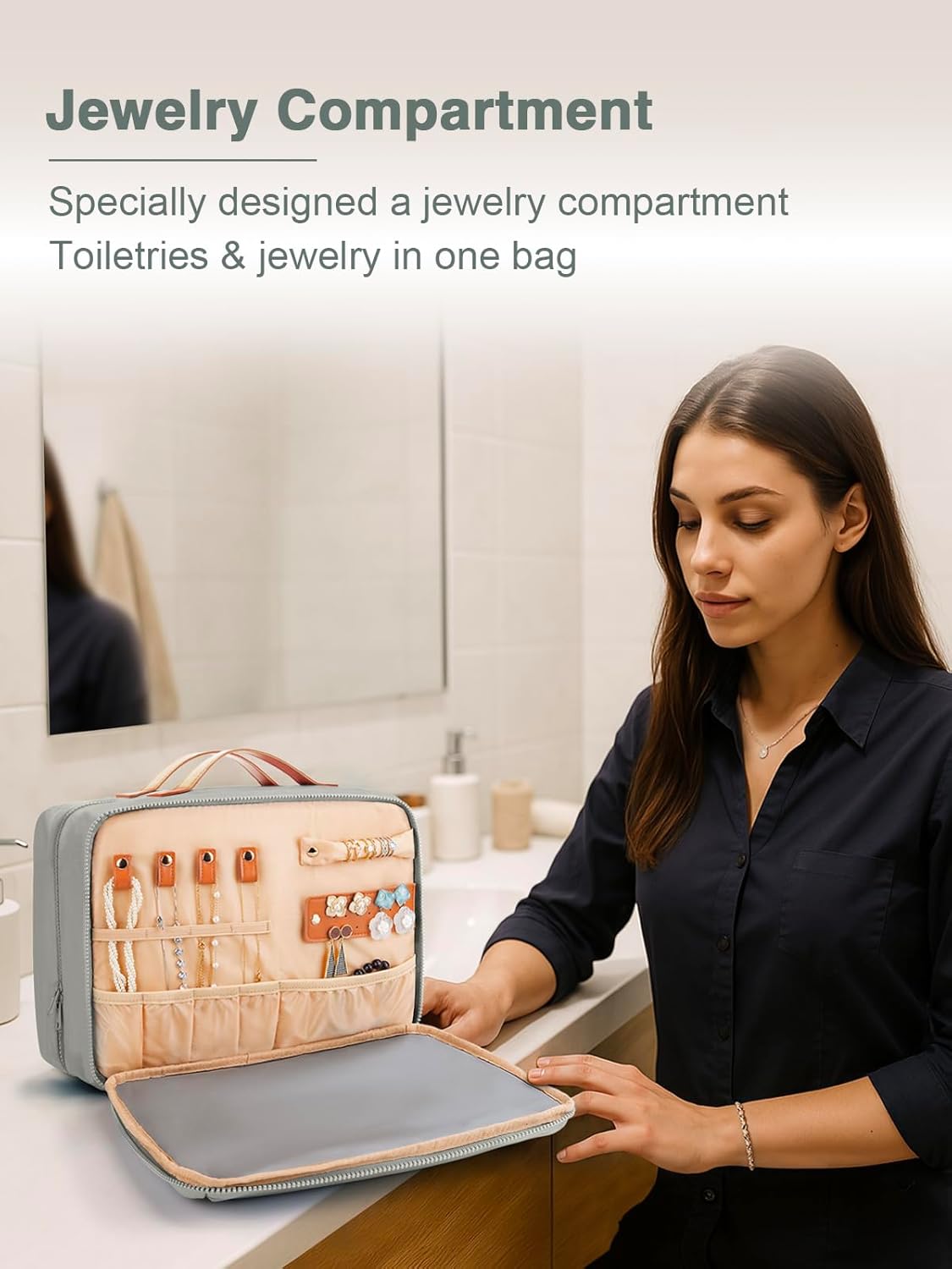 - The All-Round Organizational Expert: Size - 12.6"L x 9.5"H x 4.8"W, this spacious toiletry bag features four interior compartments that fit up to 8 full-sized toiletries plus smaller cosmetics. A front jewelry pocket and a separate wet/dry compartment keep your travel essentials organized and easy to access, making packing an easy job.