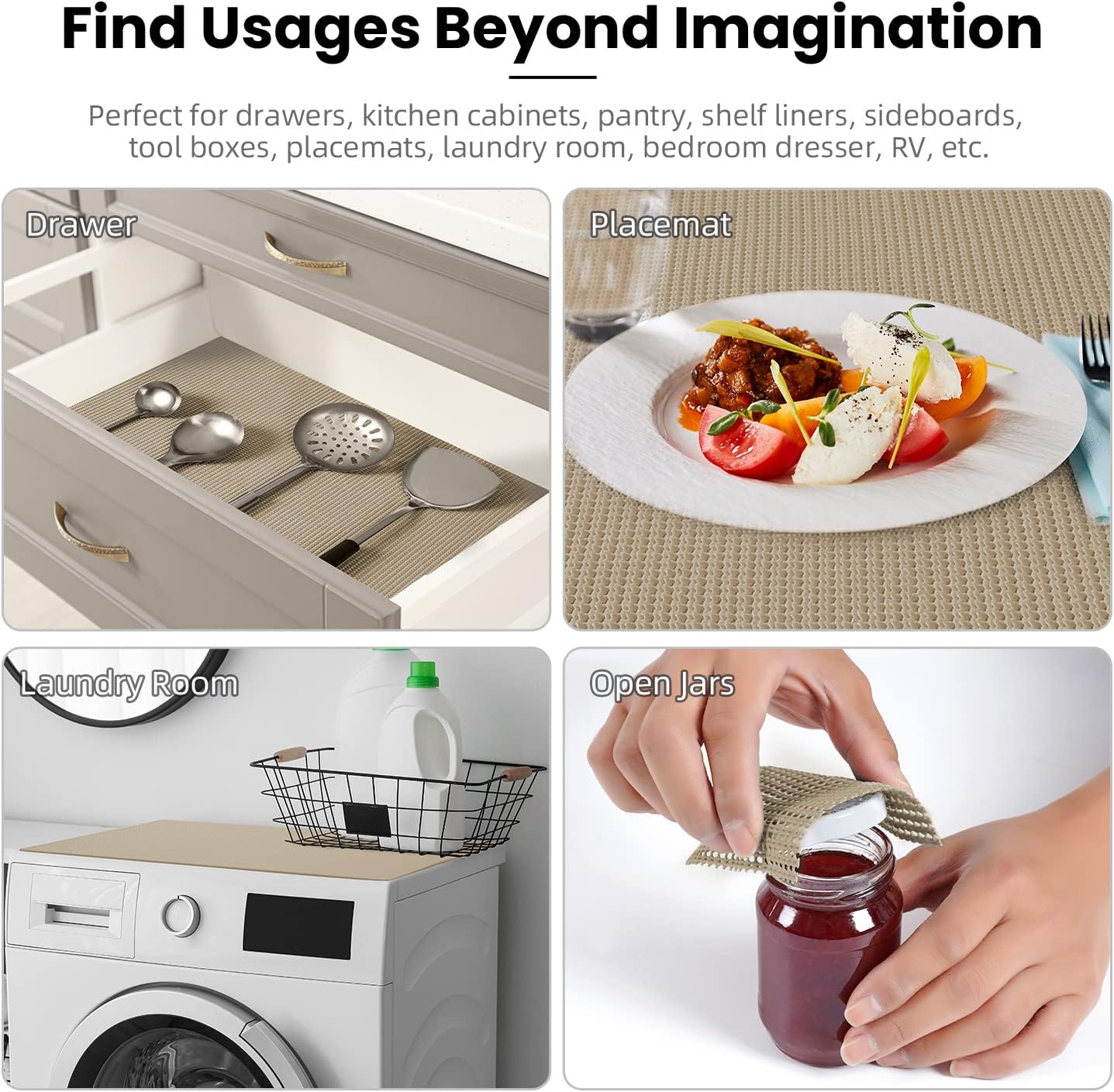 - VERSATILE USAGES - Non-slip on both sides, ideal for drawers, kitchen cabinets, pantry, shelf liners, sideboards, tool boxes, wardrobe shelves, placemats, laundry room, bedroom dresser, RV, etc. Minimize sliding, keep items in place and provide protection. Also ideal as an option for sliding sofa cushions or mattresses; craft lovers can also use it on clay and beading work. Use creativity and find more uses beyond imagination