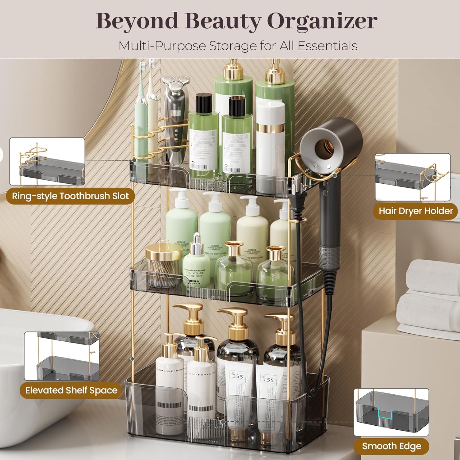 - UPGRADED STORAGE - Aveniee's premium 3-tier makeup organizer now features a built-in hair dryer rack and toothbrush/razor holder, providing extra bathroom storage space while keeping your beauty essentials neatly organized and easily accessible.