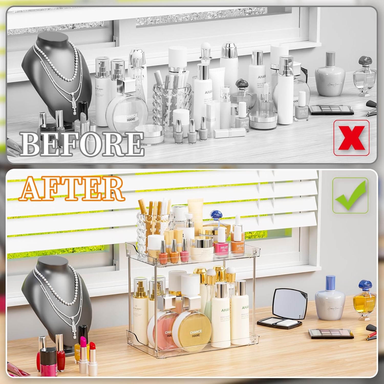- 【Space-Saving/Large Capacity/Two Tier Countertop Shelf】The upper and lower levels are designed to maximize vertical space.Say goodbye to a cluttered bathroom counter! Bathroom countertop organizers keep your makeup, lotions,Skincare,beauty products, hand soap, cotton balls,cleansers, perfumes, and other toiletries items within reach