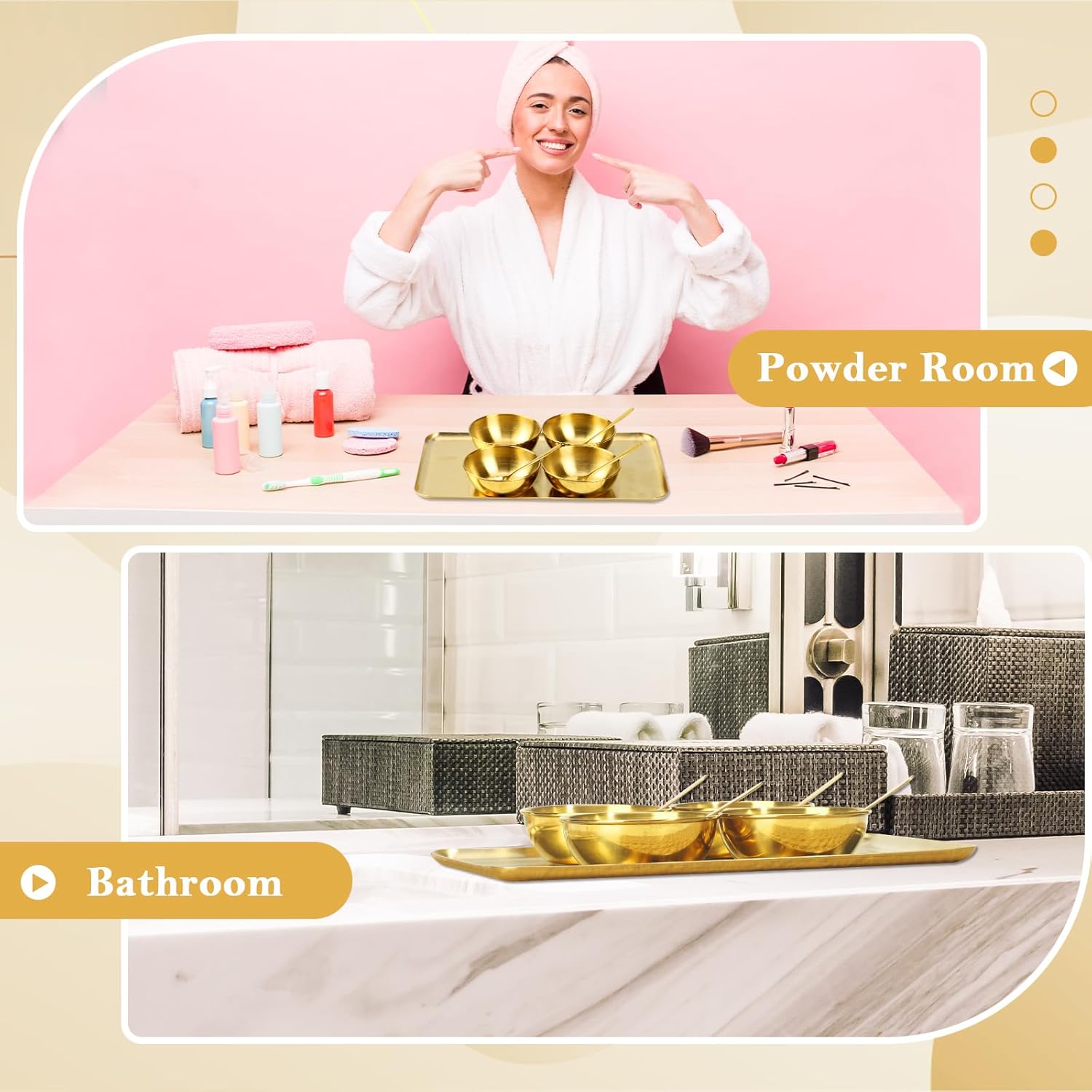 - 2.Delicate and Convenient: Our gold bowl for facials boasts a diameter of 3.3 inch and a height of 1.2 inch. The accompanying esthetician spoons, measuring 4x0.8 inch, are designed for ease of use. The 10.43x6.1 inch gold facial tray, with sophisticated design, can effortlessly hold both the bowls and spoons, making bowls and beauty scoop easily accessible. The gold metal vanity tray can also be used to store tissue or kitchen supplies Whether you store it in your bathroom cabinet or carry it in powder room, this set provides convenient and stylish organization for all your skincare needs.