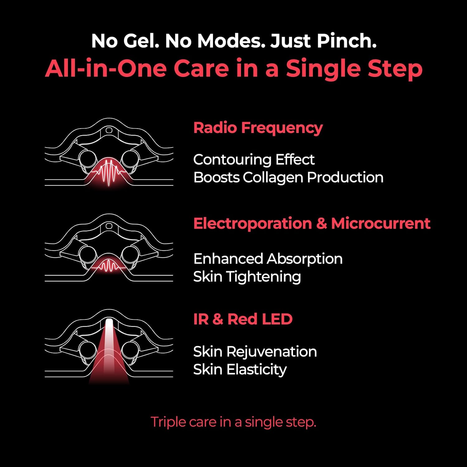 - Innovative Pinching Design — Ergonomic facial device inspired by pinching motion that delivers precise, even skin contact to visibly lift and contour the face.