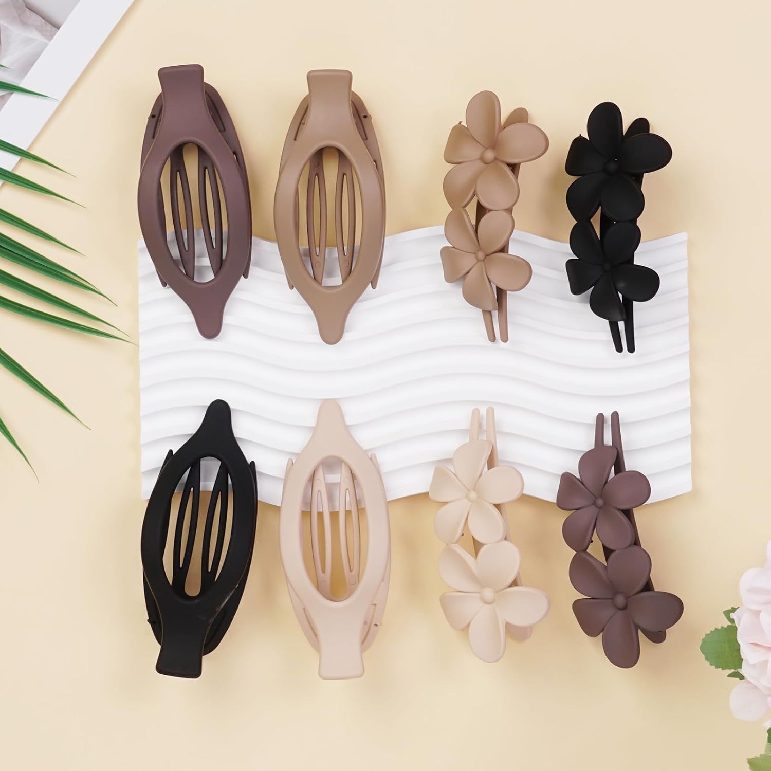 - Two Clip Styles, Four Timeless Shades:Includes 4 flat claw clips and 4 flower hair pins in Blonde, Light Brown, Dark Brown, and Black—each shade thoughtfully matched across both styles. Switch seamlessly between clean, minimalist looks and romantic, textured updos with one harmonious color palette.
