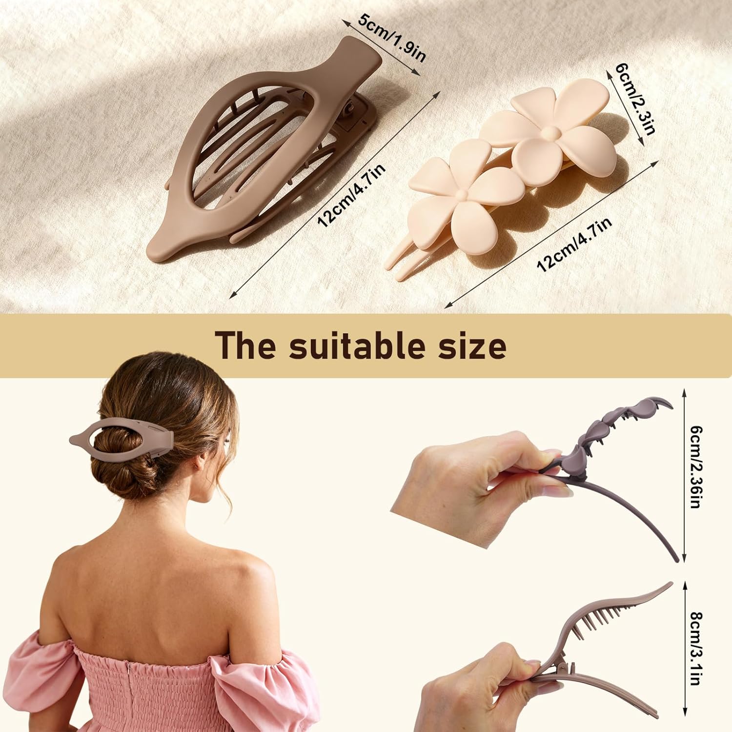 - Matte Finish Meets Sculpted Elegance:Each clip is coated with a soft matte finish that resists scratches and stays polished. The claw clips feature strong springs and curved teeth for reliable grip, while the flower pins add a soft, sculptural accent—perfect for pairing functionality with feminine detail.