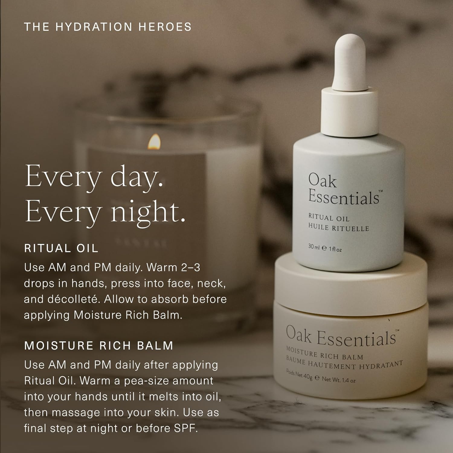 - Daily Use: Use AM & PM for a dewy complexion. Ritual Oil preps skin while Moisture Rich Balm locks in moisture for plump, bouncy skin that stays hydrated all day without greasiness or heaviness.