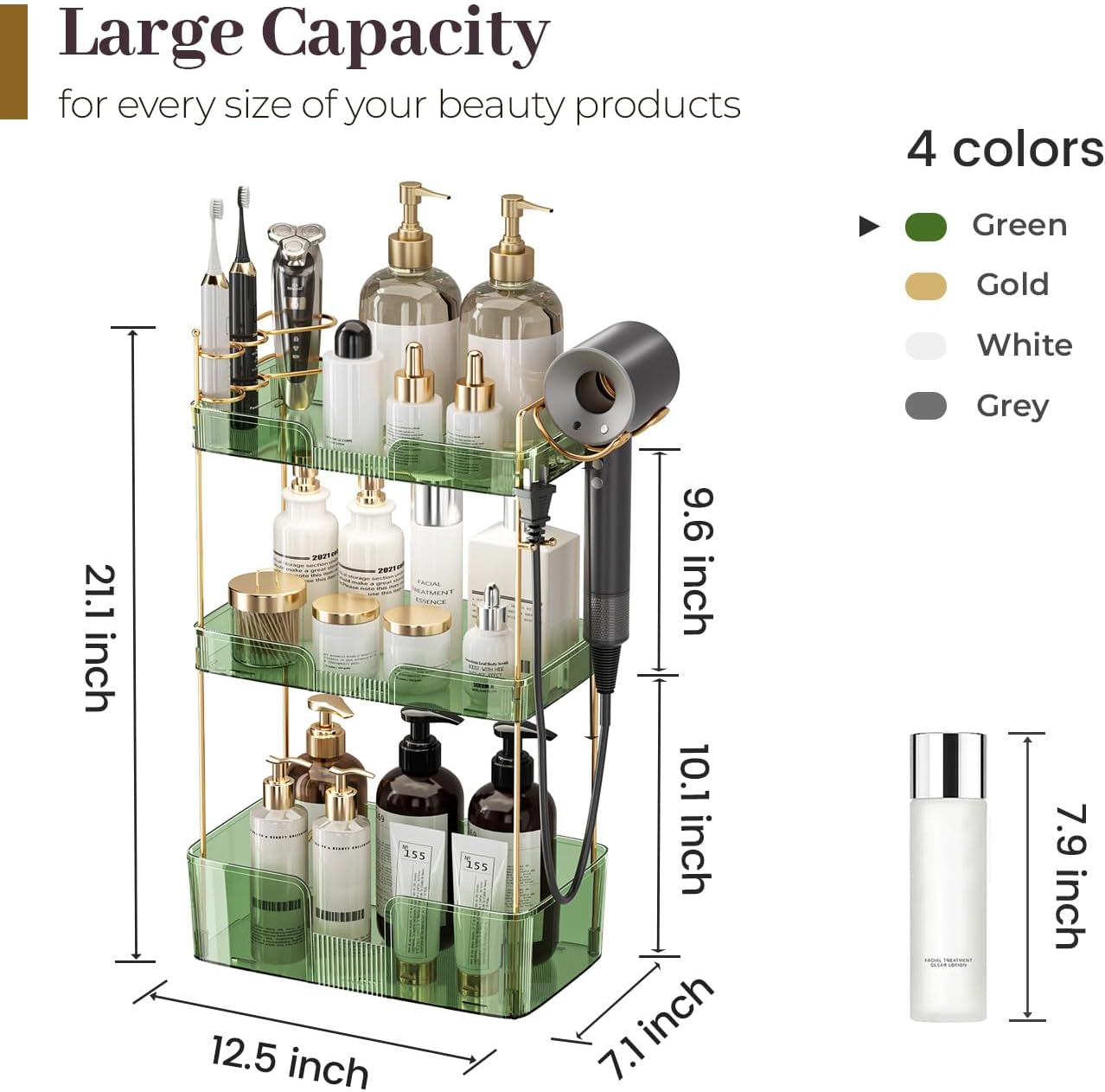 Aveniee Bathroom Counter Organizer,3 Tier Skincare Perfume Countertop Storage with Hair Dryer Rack and Toothbrush Holder, Cosmetic Makeup Tray for Vanity - Green
