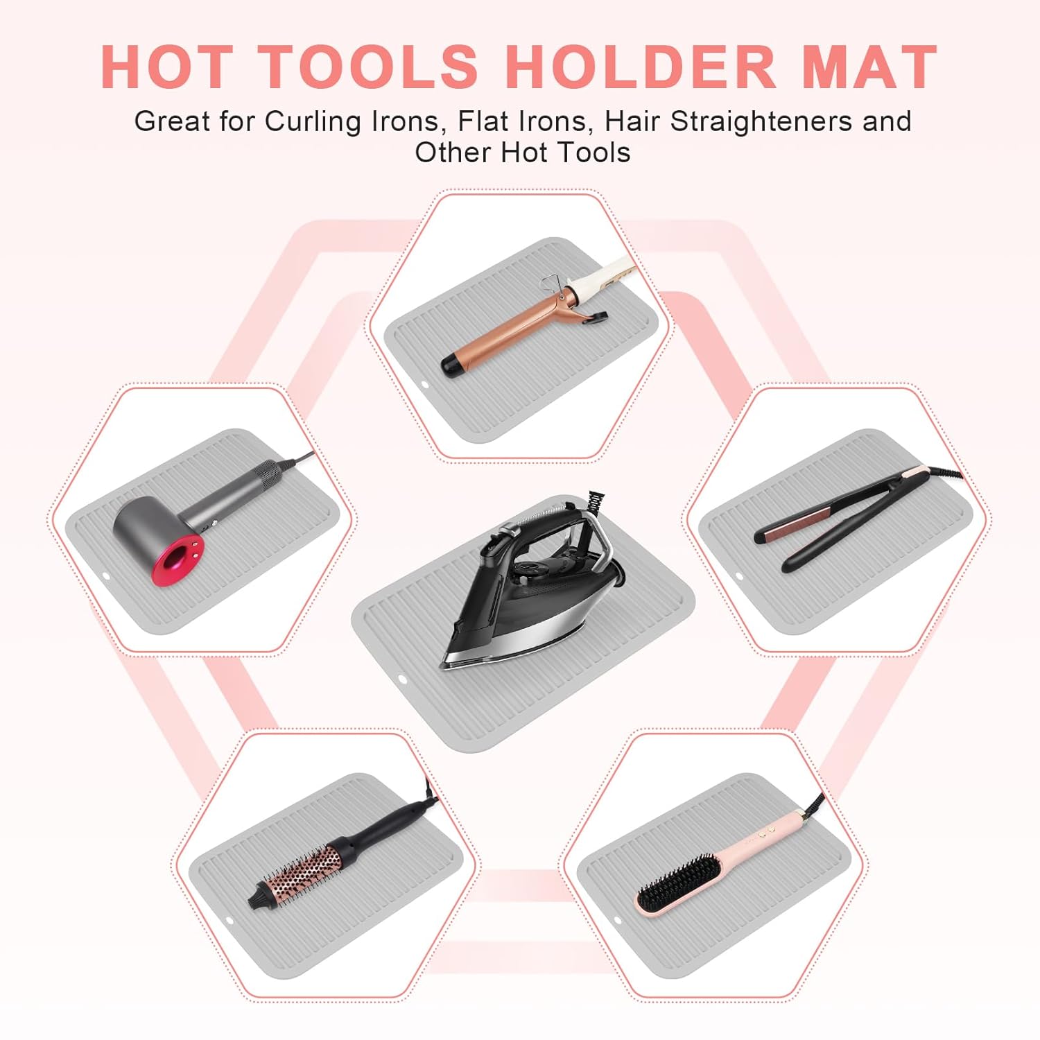 - Heat-Resistant Mat: Our silicone heat resistant mat for hair tools can withstands temperatures up to 482°F (250°C), easily resisting heat damage from various hot hair styling tools such as flat irons, hair straightener, curling irons, hot air brushes; Ideal for home use, gym vanity areas, hair salons, and travel