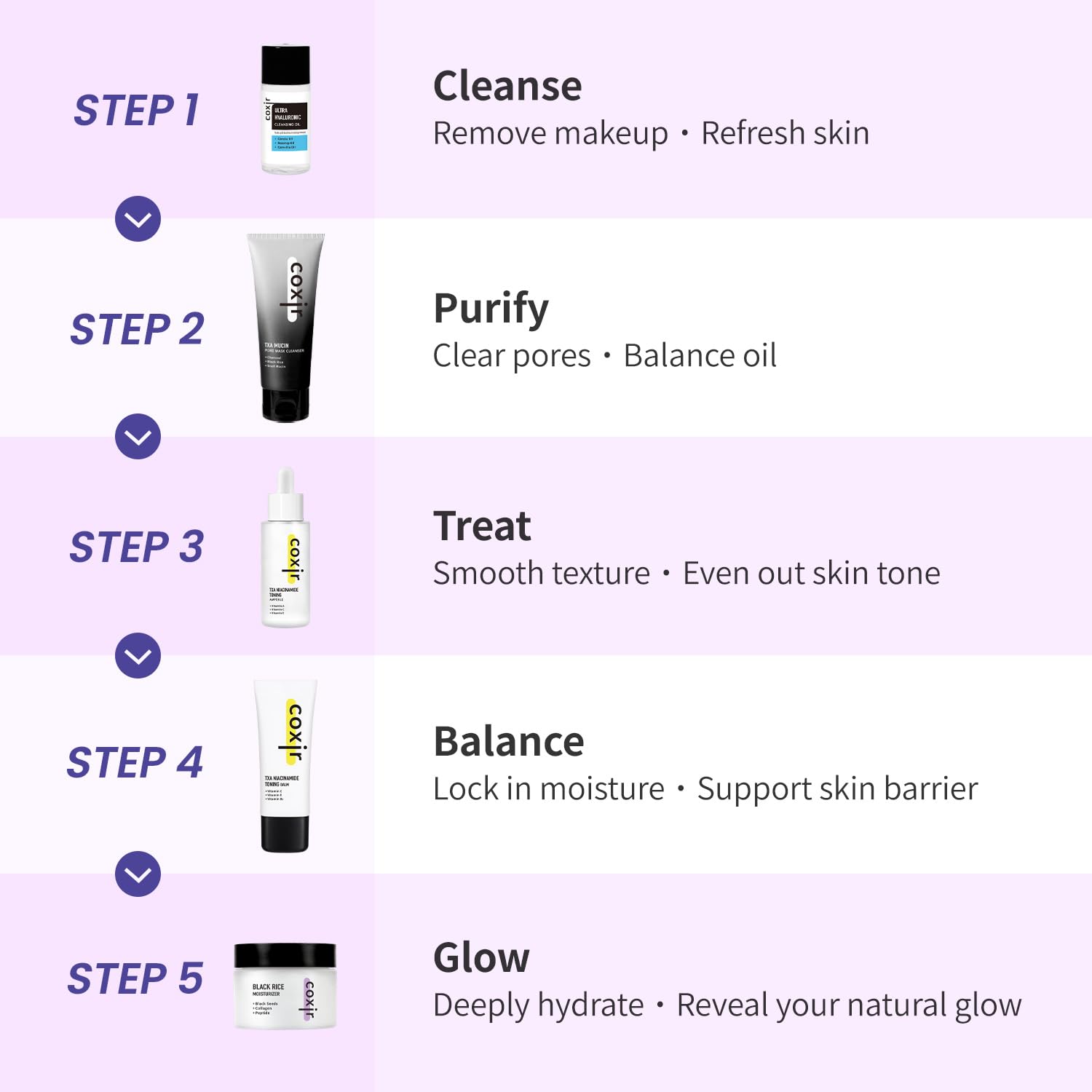 coxir K-Beauty Seoul Glow Set – 5-Step Korean Skincare Routine with TXA & Black Rice – Cleansing oil, Mask Cleanser, Ampoule, Balm & Moisturizer – Deep Hydration, Radiant Glass Skin Gift Set